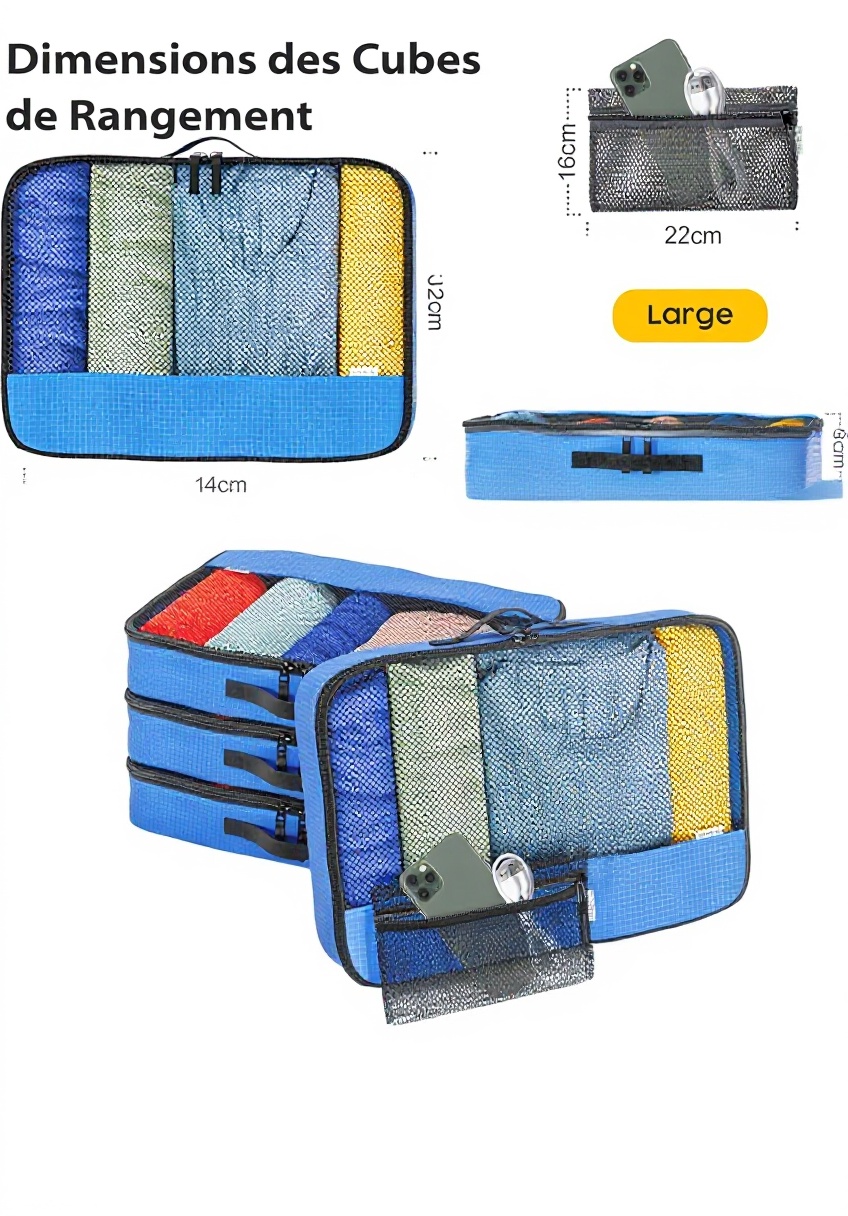 - Rangement sans plis : Gardez vos vêtements impeccables grâce à la conception des cubes qui minimise les froissements pendant le transport.